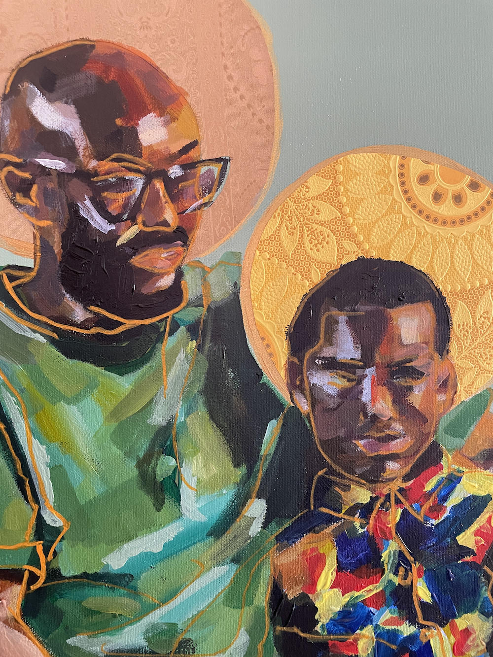In this portrait of the artist’s husband and son, notions of black fatherhood are explored, capturing the links of legacy, connection, protection, pride, comfort, destiny and masculinity.