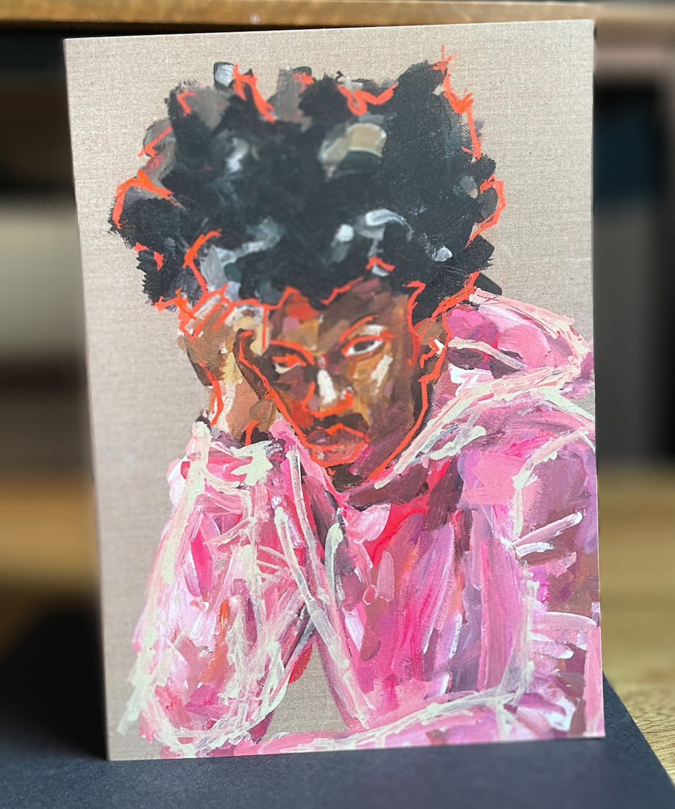 Whether gifted or framed, Yvadney Davis greetings cards are an injection of art, colour and pride. This card features acrylic on linen canvas artwork celebrating black boy joy and purpose.